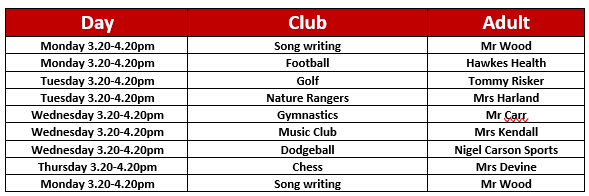 In Spring term, after-school clubs will start week beginning Monday 26th January 2026 with the last session for most clubs taking place on Friday 27th March 2026.